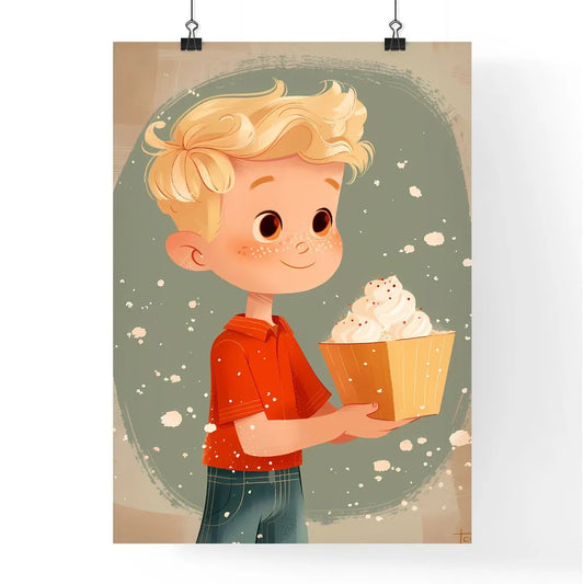 Vintage Cartoon Boy Red Shirt Blue Pants Ice Cream Box Simple Palette Muted Color Low Detail