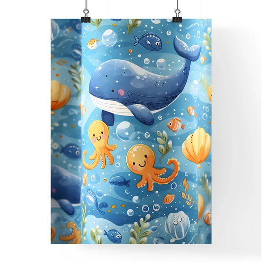 Artistic Ocean Nursery Fabric Pattern with Octopus and Whale Motifs in Blue and White