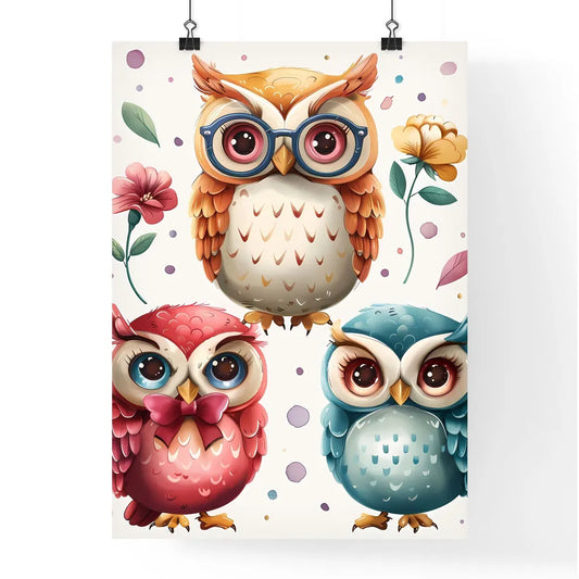 Whimsical Baby Owl Pattern: Cute pastel owls with flowers, glasses, and bows on white. High-res, colorful cartoon design for childrens wallpaper.