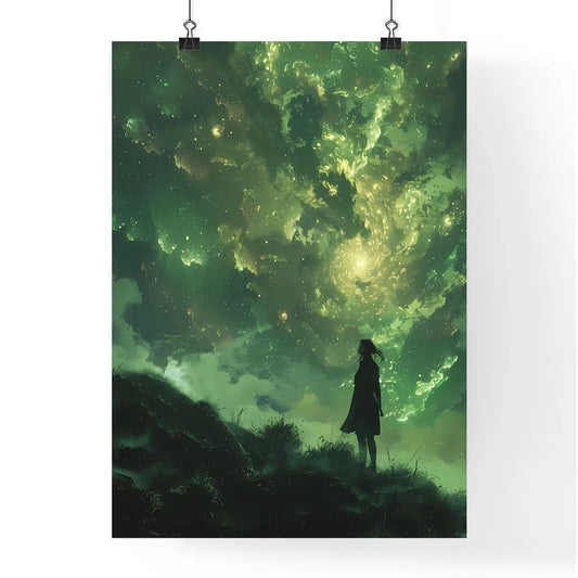Vibrant Fantasy Landscape Painting: Verdant Savannah with a Distant Silhouette of a Woman on a Hill