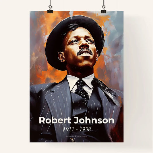 Portrait of Robert Johnson, 1911 - 1938. Impressionistic painting of a man in a suit and hat.