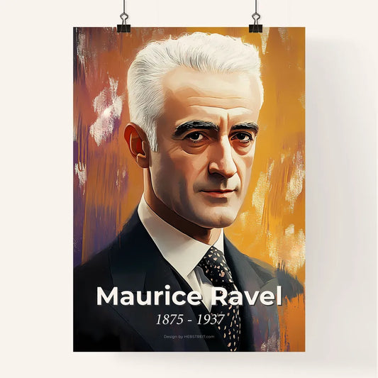Portrait of Maurice Ravel, 1875 - 1937. Impressionistic painting of a man in a suit and tie.