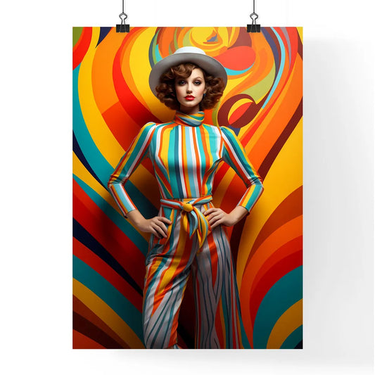 A Woman In A Striped Jumpsuit And Hat Posing In Front Of A Colorful Swirly Wall Art Print