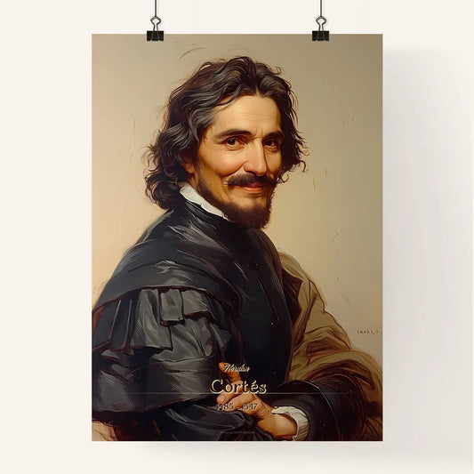 Hernán, Cortés, 1485 - 1547, A Poster of a man with long hair and beard wearing a black coat