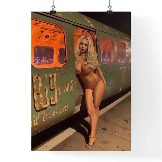 Gorgeous world war 2 era pin up Japanese woman painted on the side of a b52 bomber plane - Art print of a woman in a garment leaning on a train