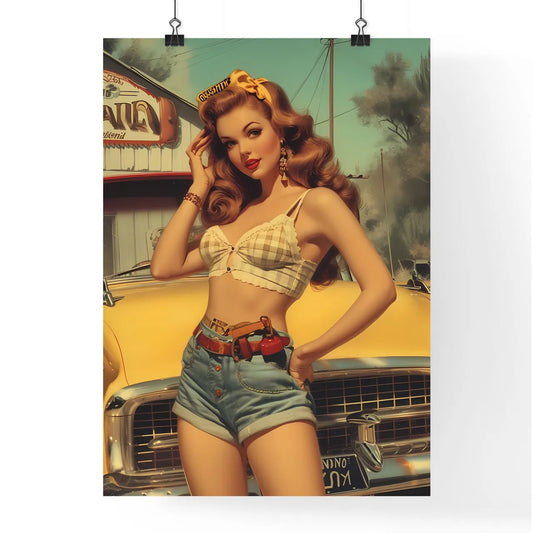 The vintage pin up girl leaning on a car - Art print of a woman posing for a picture