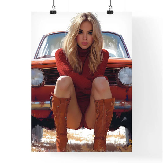 Illustration of a beautiful pin up model full body - Art print of a woman sitting on the front of a car