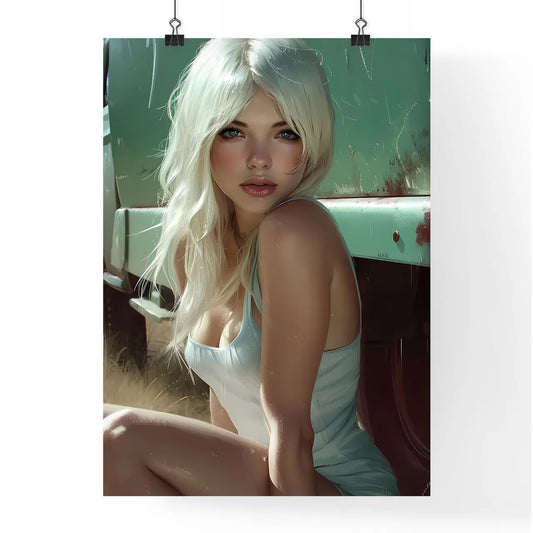 Sitting pin up factory worker girl,looking amazing - Art print of a woman sitting on a truck