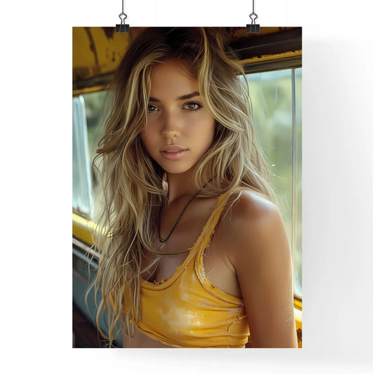 Auto mechanic - Art print of a woman posing in front of a yellow car