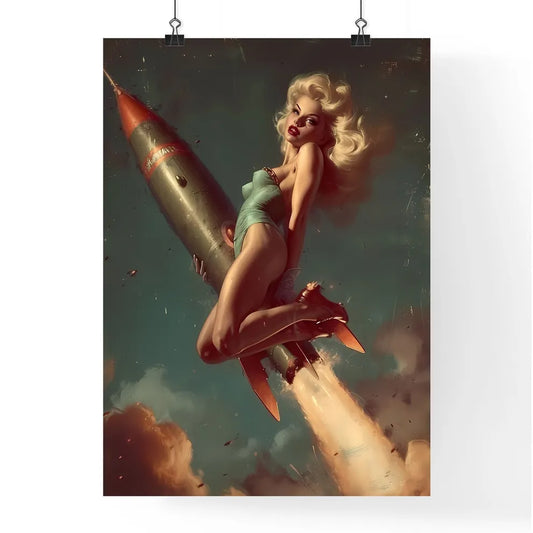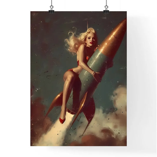 The head nurse sharply directed the nurses riding a rocket - Art print of a woman in a swimsuit flying on a rocket