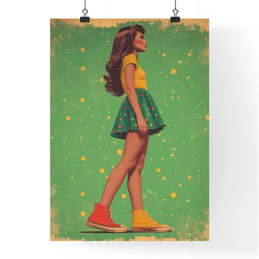 Side profile, illustrative, large outlines, beautiful pin up girl - Art print of a woman in a green skirt and yellow boots