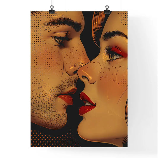Comic Strip Style Artwork of a Retro 1970s woman with unique facial features, kissing a man, showcasing vibrant halftone texture and grainy yellow and black tones