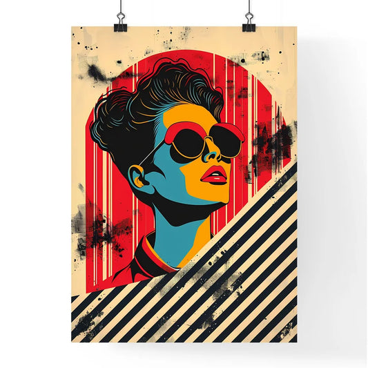 80s Op-Art Portrait: Vibrant Striped Woman with Sunglasses on Retro Painted Poster