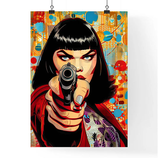 Vibrant Pop Art Woman with Gun: Hard Edge Painting Inspired by Adi Granov, Poster Art with Visibly Enlarged Print Screen Dots