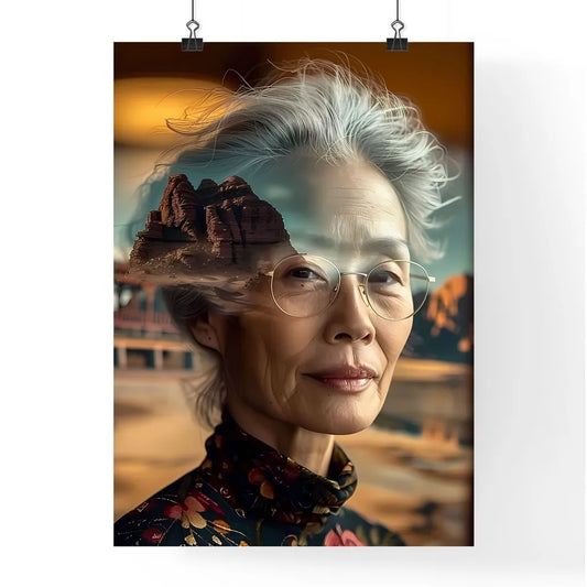 Elegant Asian Grandma Portrait with Glasses, Mountain Double Exposure, Vibrant Painting, Senior Woman, Happy Smile, Leisure Scenery