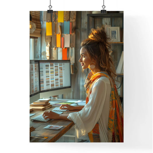 Female interior designer selecting wood samples, warm light, choosing paint colors, vibrant painting, computer, art