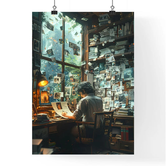 Digital art of a critic contemplating amidst floating reviews, showcasing the artist's painterly style.