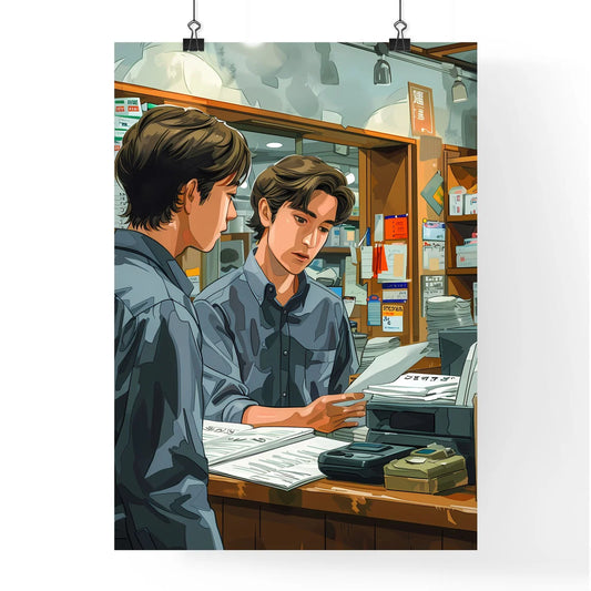Vibrant Painting Depicting Two Men Examining Documents: Colorful Art Collaboration