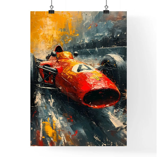 A Poster of Formula One style race car - A Red Race Car With A Person Driving On The Front