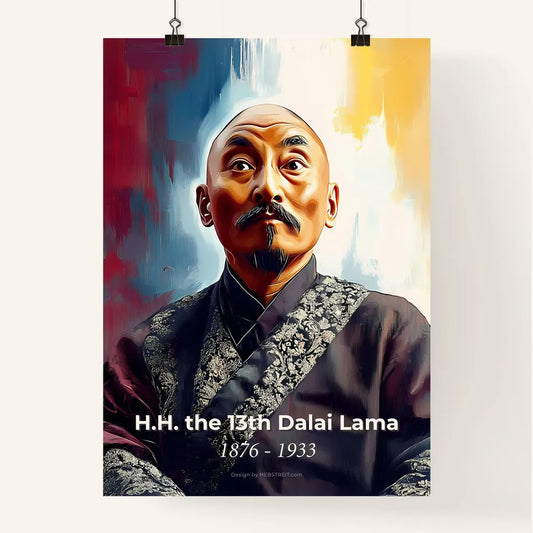 Portrait of H.H. the 13th Dalai Lama, 1876 - 1933. Impressionistic painting of a man with a mustache and a mustache holding his hands together.