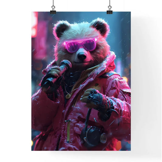 A clever, cool teddy bear - Art print of a bear wearing pink sunglasses and a pink jacket holding a microphone
