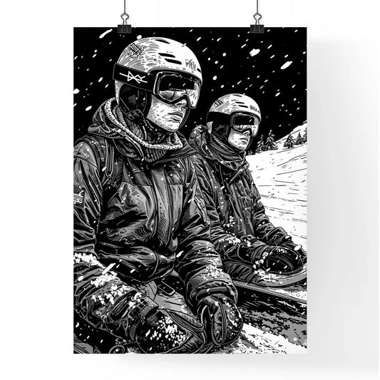 A Poster of coloring page for kids Snowboarding - A Couple Of People Wearing Helmets And Goggles Sitting On Snow