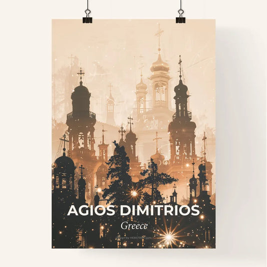 Agios Dimitrios City Skyline Silhouette Art Poster - A silhouette of a building with towers and trees