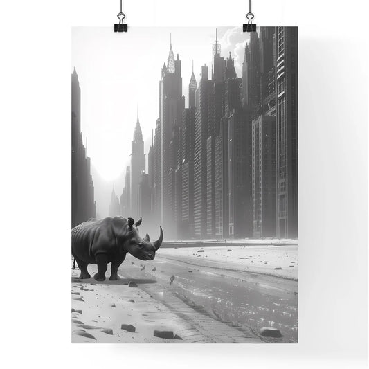 Surreal Cityscape: Solitary Rhinoceros Amidst Urban Giants in Vibrant Monochrome, HD, Surrealism, Ambient Occlusion, Water