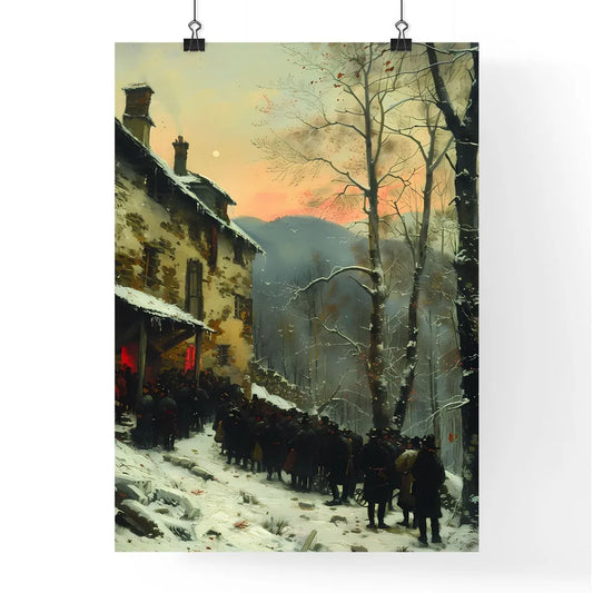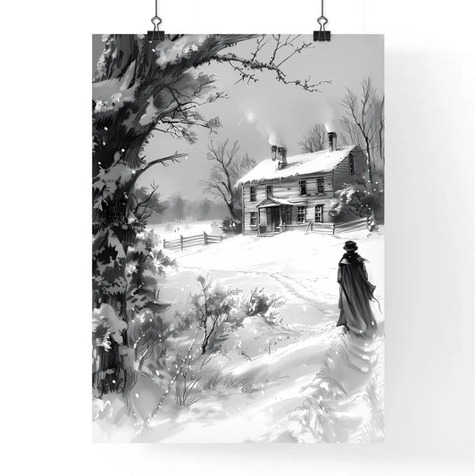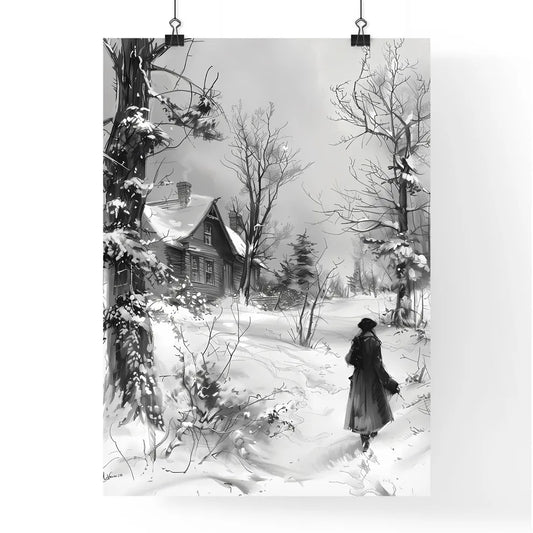 Vibrant Winter Landscape Painting: Snowy Scene with Old House, Person Walking, Trees