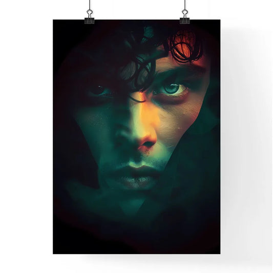 Vibrant Art Painting of a Silhouette Head with Dark Hair and Green Eyes on Black Background
