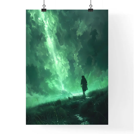Surreal Savanna Silhouette: Fantastical Painting of a Person in an Expansive Green Field Bathed in Ethereal Light
