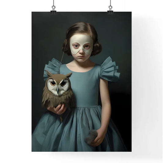 A Poster of a young child dressed in a blue dress - A Girl Wearing A Blue Dress And An Owl Mask