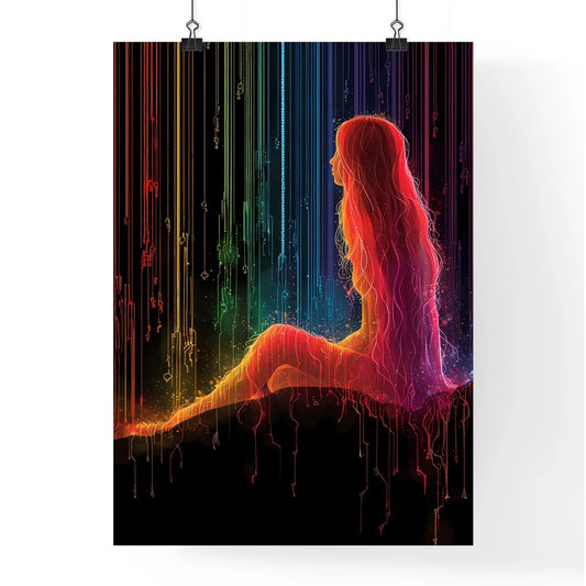 A continous one line minimalist illustration of a pretty girl - Art print of a woman sitting in a rainbow stream of rainbow colors