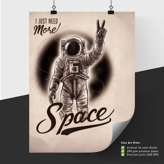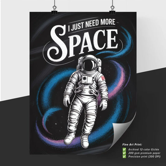 Whimsical Astronaut Floating in Space with Inspirational Phrase: 'I Just Need More Space' for Creative Imagery.