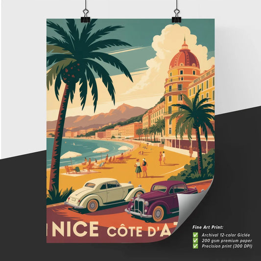 Vibrant Vintage Scene of Nice, Côte d'Azur: Sunlit Beach, Classic Cars, and Palm Trees
