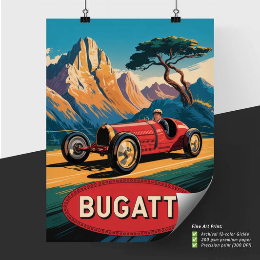 Vintage Bugatti Racing Car Against Majestic Mountain Landscape in Retro Style Illustration.