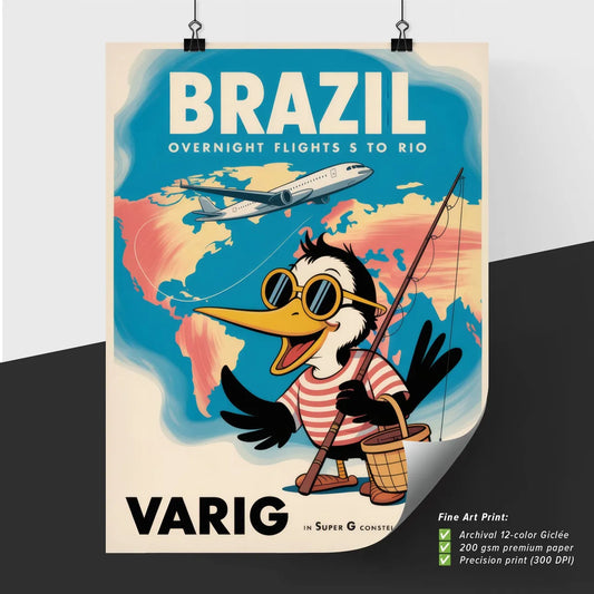 Vintage Travel Poster: Experience Brazil with Varig's Overnight Flights to Rio, Featuring a Cheerful Cartoon Penguin.