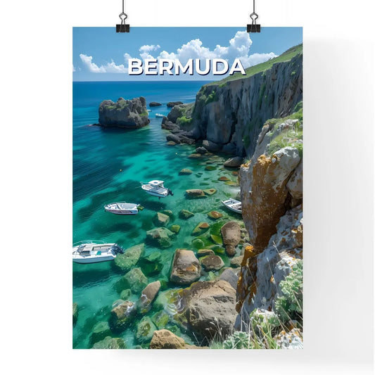 Artful Bermuda: Vivid Painting of Boats in Serenity, Backdropped by Rocky Coast and Towering Cliff