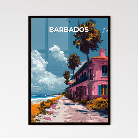 Abstract Barbados Artwork, North America - Pink Building with Palm Trees on Beach