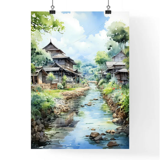 Malaysia Village In Watercolor Painting - A Watercolor Of A River With Houses And Trees
