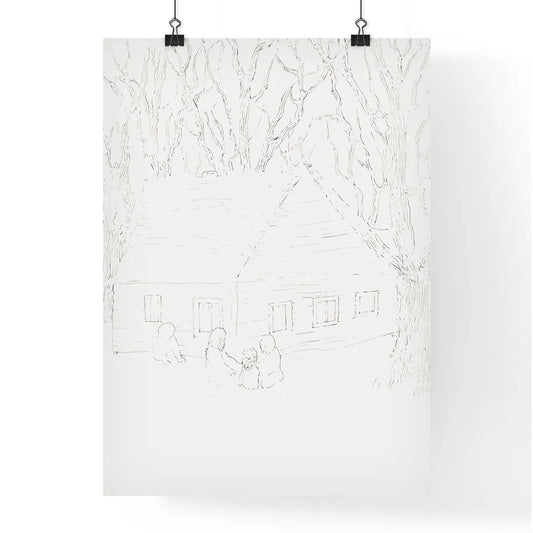 Two Little Humas In Front Of A Little House - A Drawing Of A House And A Group Of People