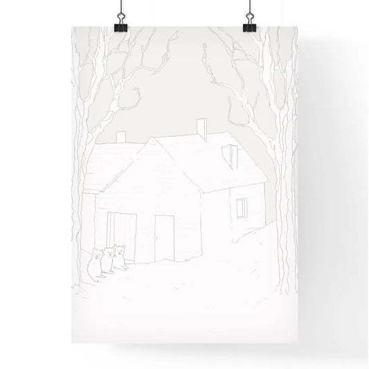 Two Little Humas In Front Of A Little House - A Drawing Of A House And Cats