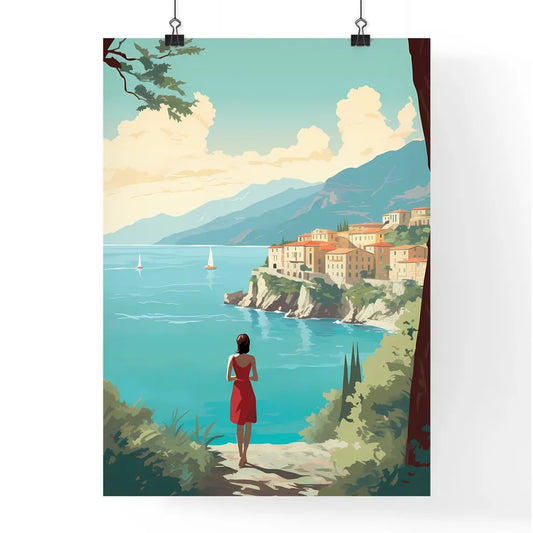 Woman Looking At A Town On A Cliff Overlooking A Body Of Water Art Print