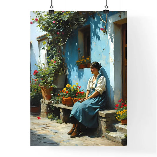 A Poster of oil painting of a 34 view - A Woman Sitting On A Bench Outside A Building