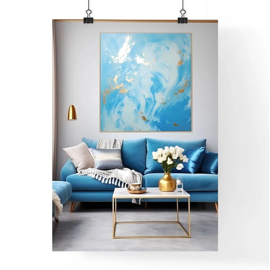 Blue And Gold Living Room With A Blue Couch And A Painting On The Wall Art Print