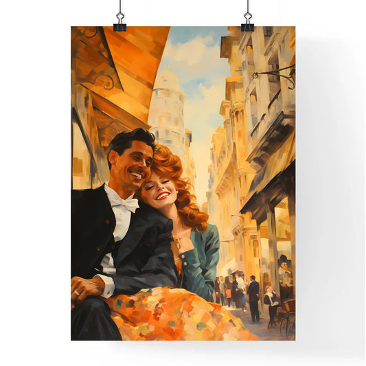 Man And Woman Smiling And Sitting On A Bench In A City Art Print