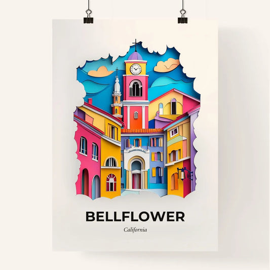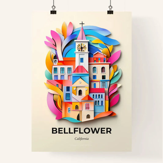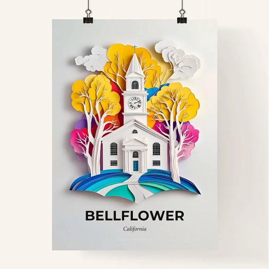 Vivid Bellflower, California - a paper cut of a church with a clock tower