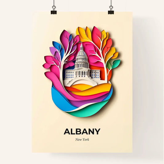 Vivid Albany, New York - a paper cut of a capitol building surrounded by colorful leaves