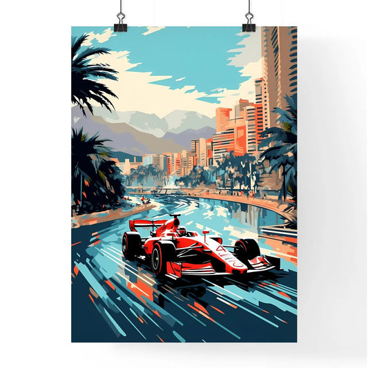 Race Car On A Road With Palm Trees And Mountains In The Background Art Print
