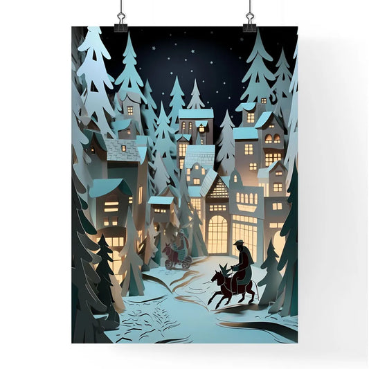 A Poster of paper art paper cut animation - A Paper Cut Out Of A Town With Houses And A Man Riding A Horse